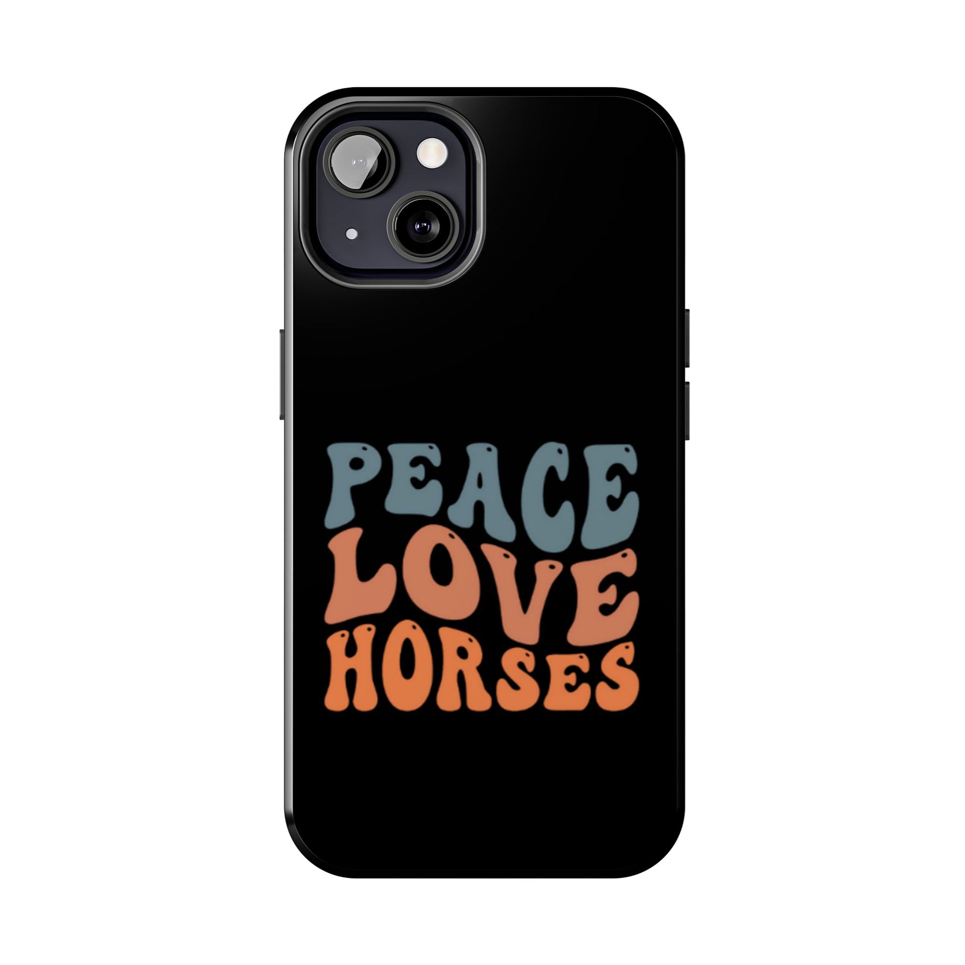 Carry a soft, vintage vibe wherever you go with this glossy phone case. The bold retro lettering — “PEACE LOVE HORSES” in sunwashed blue and warm orange — feels like a carefree afternoon at the barn: slow, sunny, and full of easy smiles. The deep black background makes the colors pop while keeping the look grounded and wearable every day.
